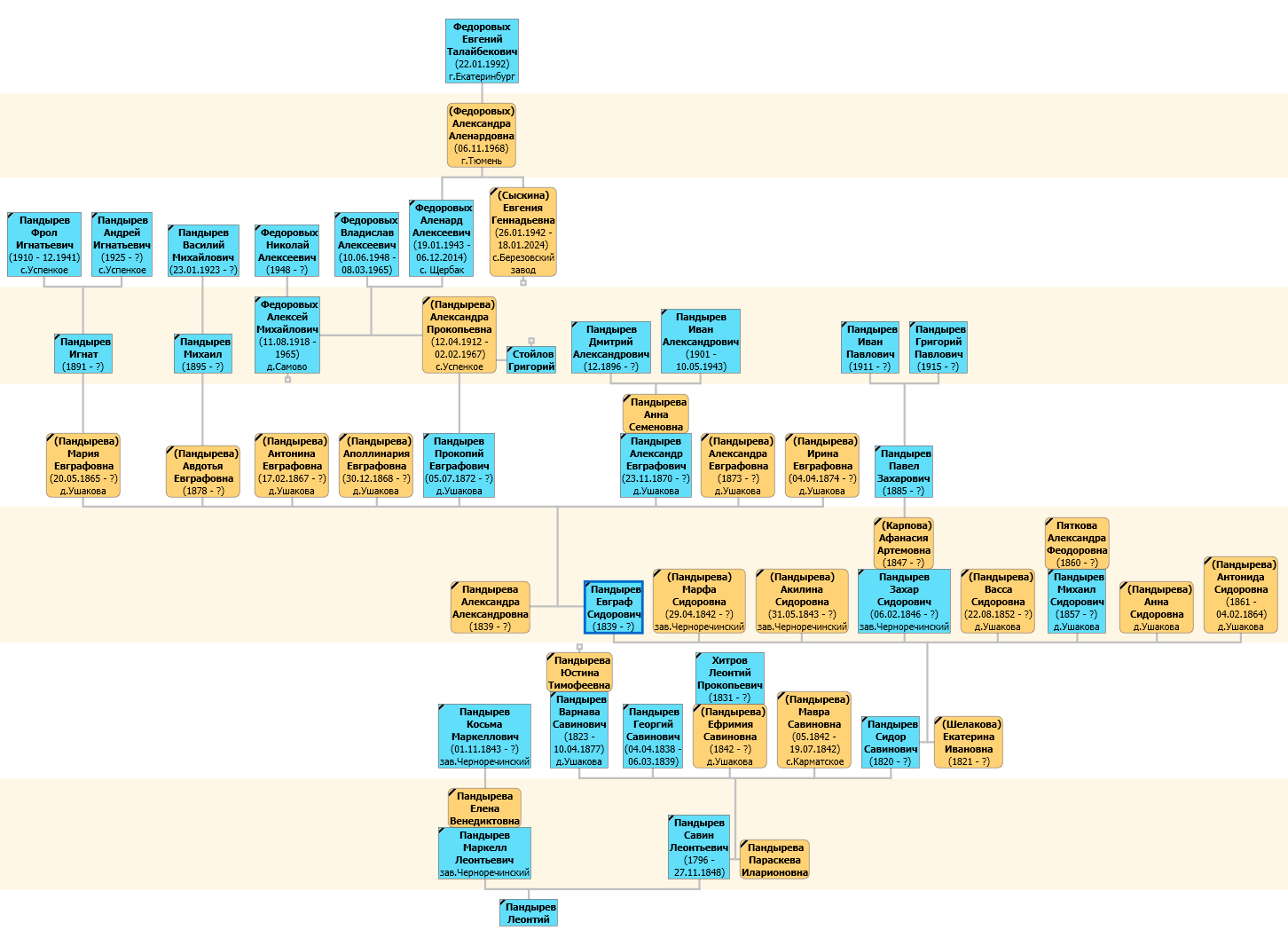 Глава большого семейства, старший сын Сидора Савиновича и Екатерины Ивановны Пандыревых (в девичестве Шелаковой). На момент проведения «Первой всеобщей переписи населения Российской империи» 1897 года Евграф Сидорович проживал в деревянном доме, крытом деревом, в селе Успенское.